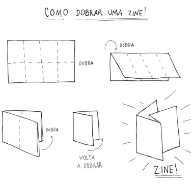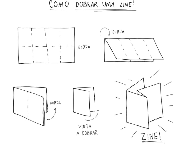 Numa Zine, tu escolhes o tema. Pode ser sobre super-heróis, gatinhos, culinária, desenhos ou até um diário secreto. Só precisas de uma folha de papel e canetas. Podes dobrar a folha de uma forma especial para que vire um livrinho de 8 páginas, sem precisar de cola!